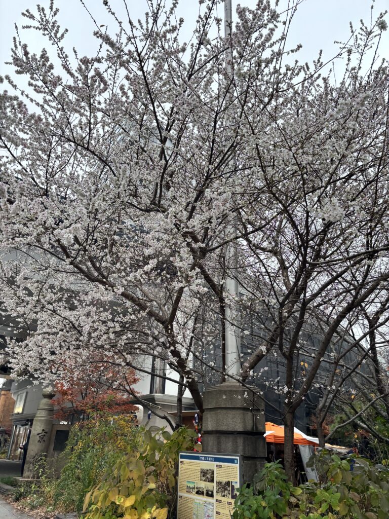 通りがかる人々は足を止め、季節外れの桜にカメラを向けたり眺めたり✨年末の慌ただしさの中にちょっとした安らぎを感じている様子でした🌸